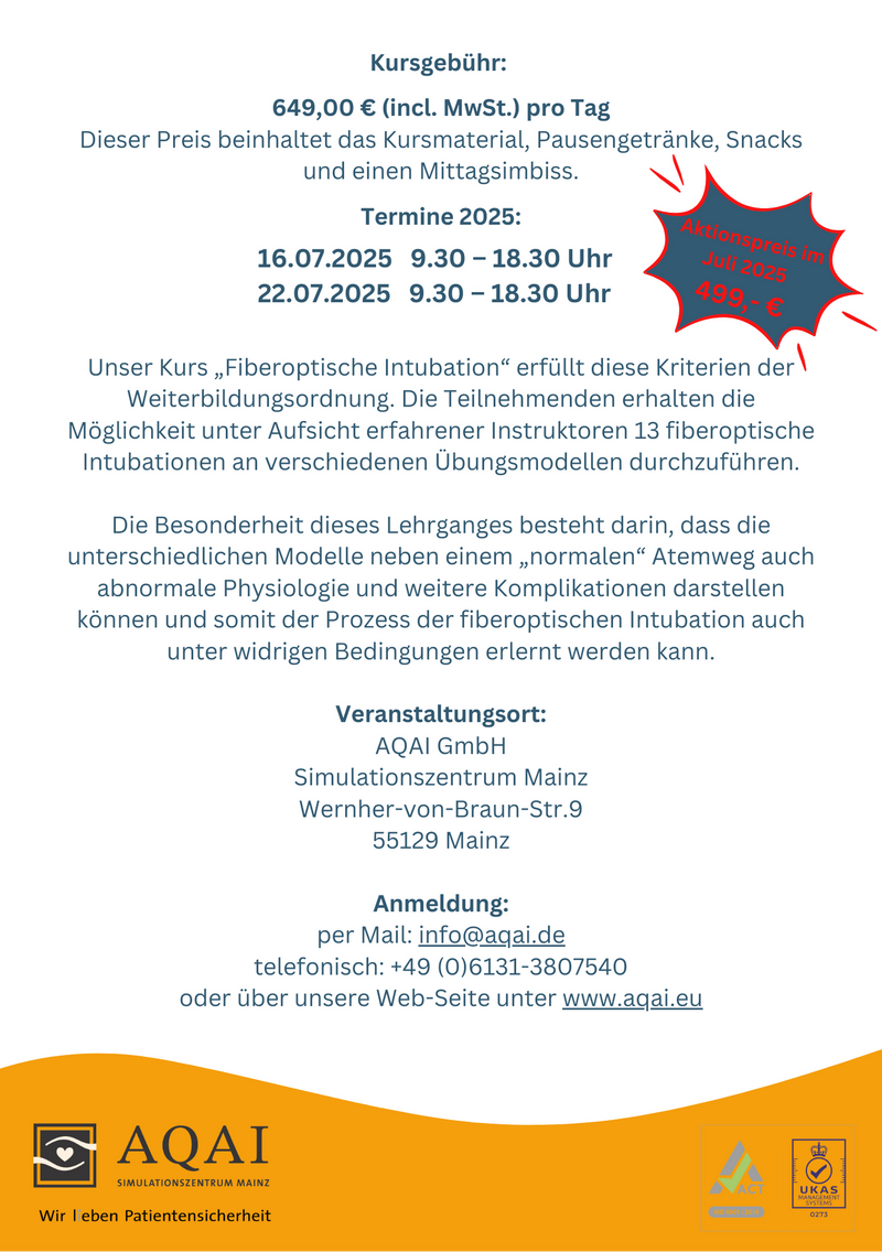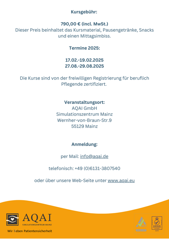 Zur AQAI-Fortbildung kann ich eine positive Rückmeldung geben. Mir hat die Vernetzung von Theorie und Praxis (Simulation) gut gefallen. Die Atmosphäre im Team war sehr gut, die Gruppengröße war sehr günstig.