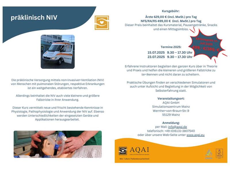 Dieser Kurs vermittelt neue und frischt bestehende Kenntnisse in Physiologie, Pathophysiologie und Anwendung der NIV auf. Ebenso werden Unterschiedlichkeiten der eingesetzten Geräte und Applikationen herausgearbeitet. Erfahrene Instruktoren begleiten den ganzen Kurs über in Theorie und Praxis und helfen die kleineren und größeren Fallstricke zu (er-)kennen und nicht daran zu scheitern. Praktische Übungen finden an verschiedenen Simulatoren und auch unter Aufsicht und Begleitung in der Möglichkeit von Selbsterfahrung statt.