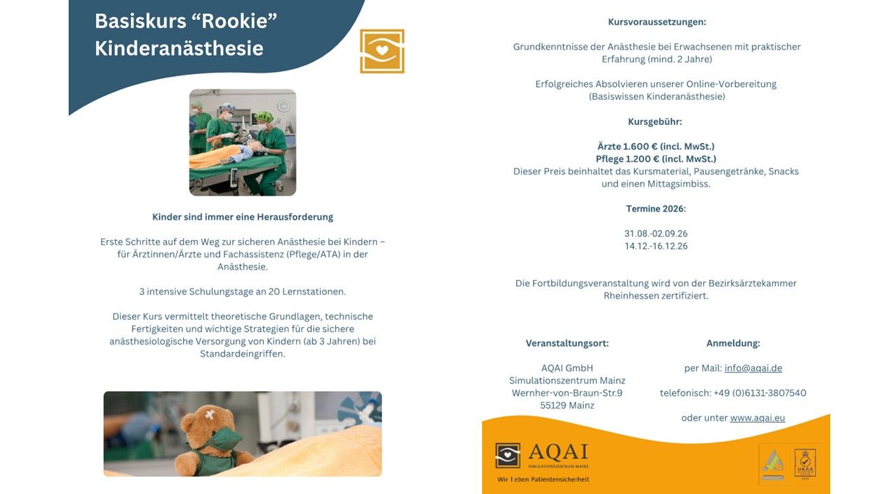 Neu bei AQAI: Rookie-Kurs Kinderanästhesie für (Wieder-) Einsteiger und bewährte Zwischenfall-Trainings für Fortgeschrittene verbessert